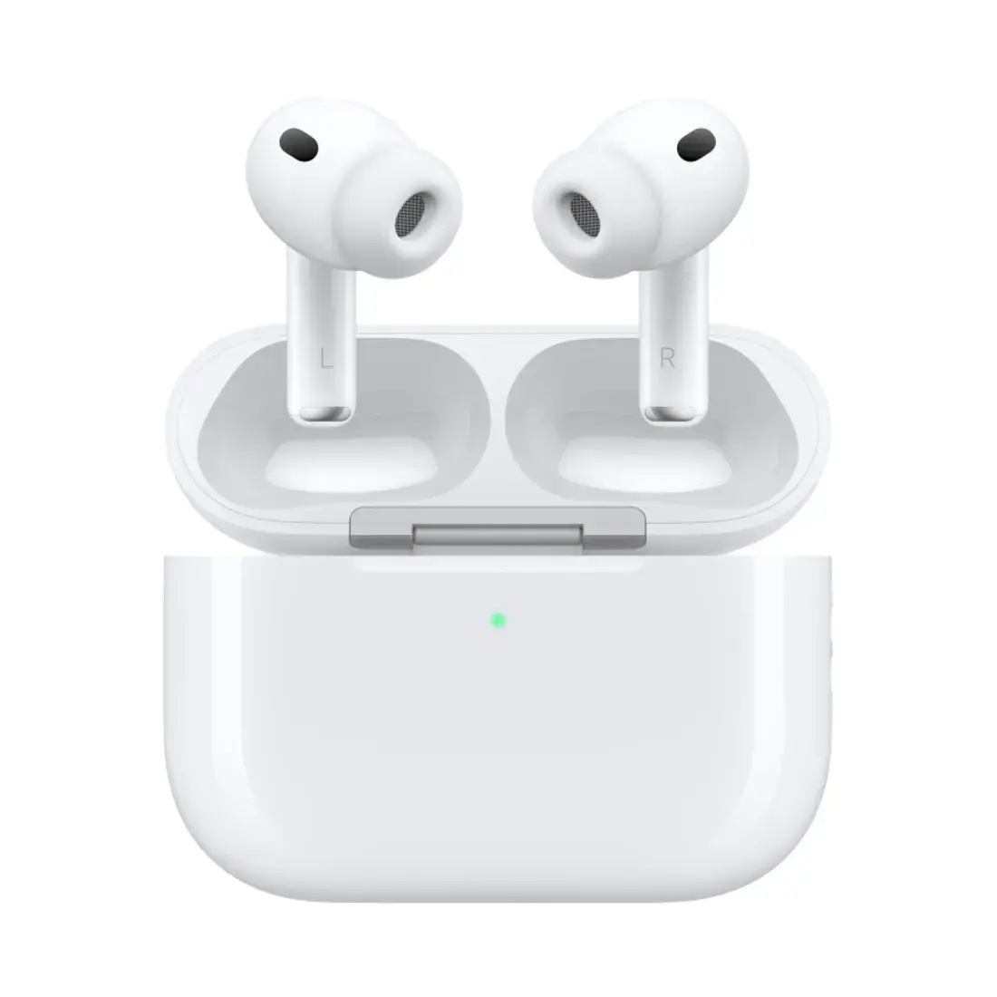 Внутриканальные наушники Apple AirPods Pro треть поколения выполнены в белом цвете. Они оборудованы модулем Bluetooth версии 5.3, чипом Apple H2 и сдвоенными направленными микрофонами с системой активного шумоподавления. Эта модель быстро подключается к голосовому ассистенту Siri. На корпусе есть кнопки управления. Ресурса аккумулятора хватает на 6 часов непрерывного разговора. Гарнитура поддерживает функции быстрой и беспроводной зарядки. Корпус выполнен из пластика, обладает классом влагозащиты IPX4. В комплекте — четыре пары амбушюр разных размеров, чехол, кабель с коннекторами USB Type-C. Вес устройства — 51 г. Новая функция прямого перевода диалогов