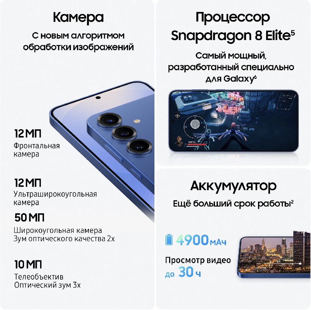 Samsung Galaxy S25+ - элегантный премиальный дизайн, прочная алюминиевая рамка, иммерсивный экран и изысканная камера в более компактном корпусе, который теперь еще удобнее держать в руке. Galaxy S25+ оснащен самым мощным, специально разработанным для него процессором, улучшенным аккумулятором и инновационным искусственным интеллектом.